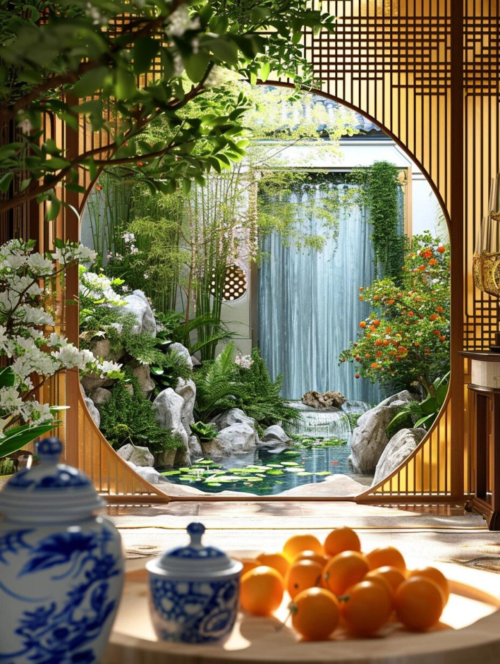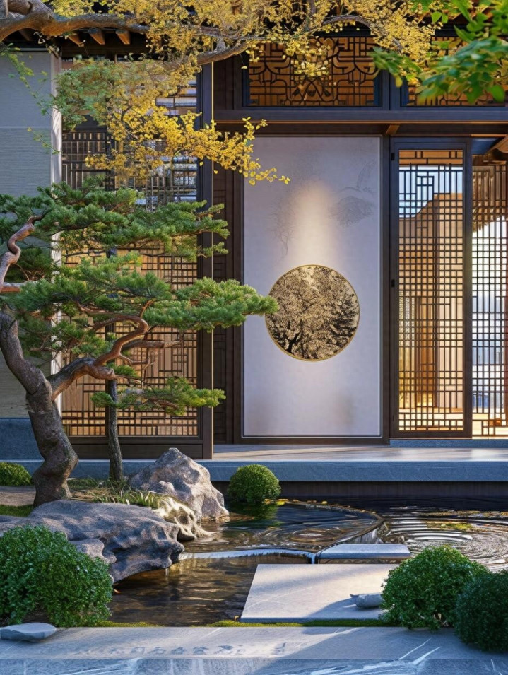 一方静池如明镜,倒映天光云影;水中奇石错落,仿佛自然生长;苍松遒劲,翠柏挺拔,无声传递着东方气韵。木质门窗配以精致雕花,在简洁中暗藏匠心;一道圆门如天然画框,将满院诗意定格成流动的山水长卷——这已不仅是院子,更是现代人渴求的心灵休憩地。